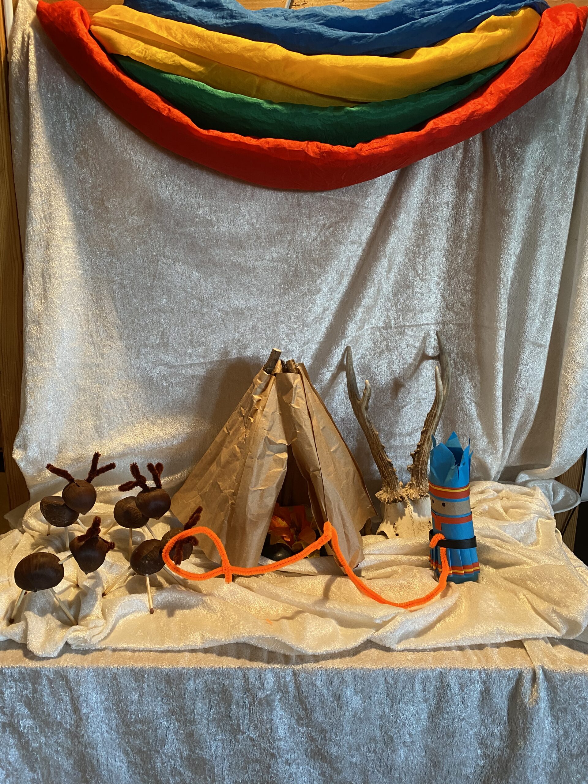 Et lite bord på avdelingen er pyntet med duker og silke i farger som representerer årstidene, og dukker, figurer og ting som viser hva måneden kan by på. Dette er et lite tablå som speiler årstidene i naturen og viser hvordan de kommer til uttrykk i barnehagen.